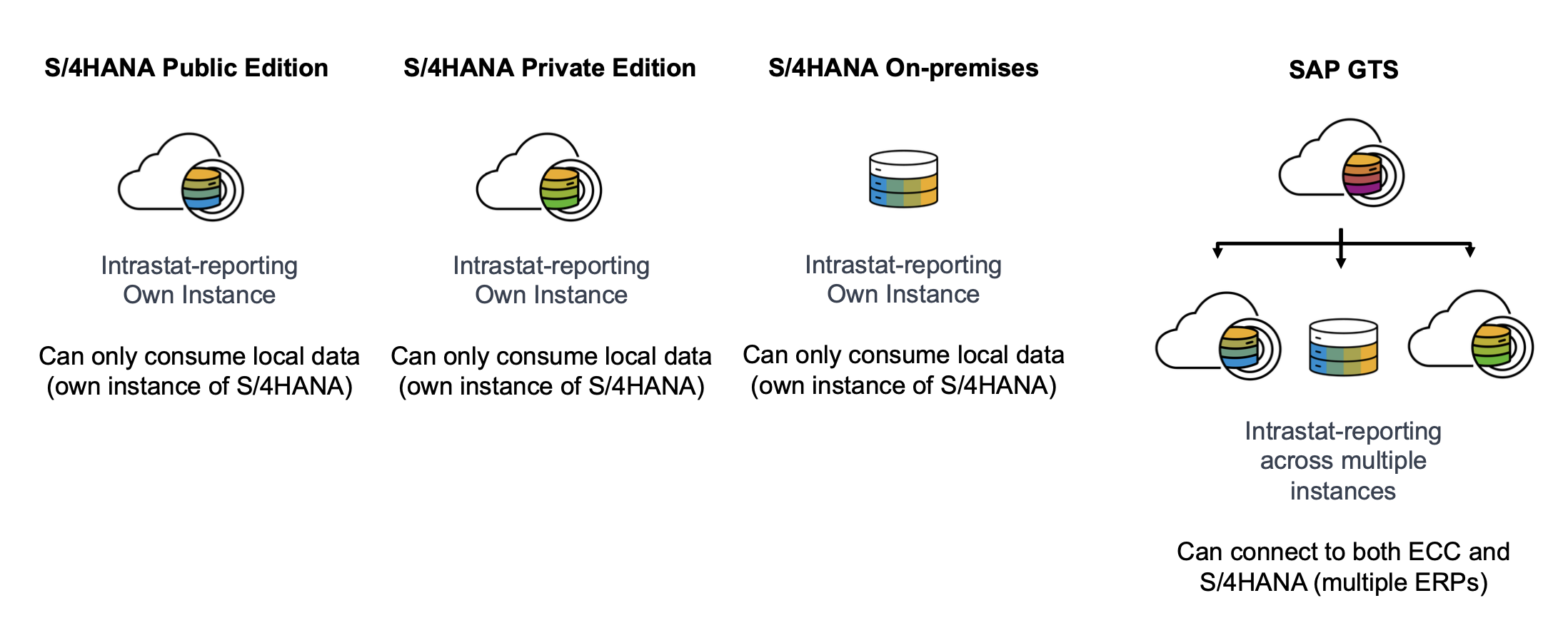 Mientras que SAP GTS, edición para SAP HANA puede realizar informes de Intrastat en varios sistemas ERP, tanto SAP ECC como SAP S/4HANA, los informes de Intrastat dentro del módulo de comercio internacional de SAP S/4HANA solo pueden consumir datos de su propia instancia.