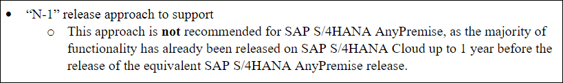 Ya no es relevante pensar en actualizar a la versión N-1, siendo N la más reciente, como un medio para lograr un sistema estable porque cada versión de S/4HANA en las instalaciones se prueba durante un año en la nube antes de su lanzamiento.