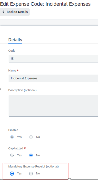 Menú de administración > código de gasto > seleccionar el código de gasto y marcar "sí" para el elemento de configuración "Recibo de Gastos Obligatorio".